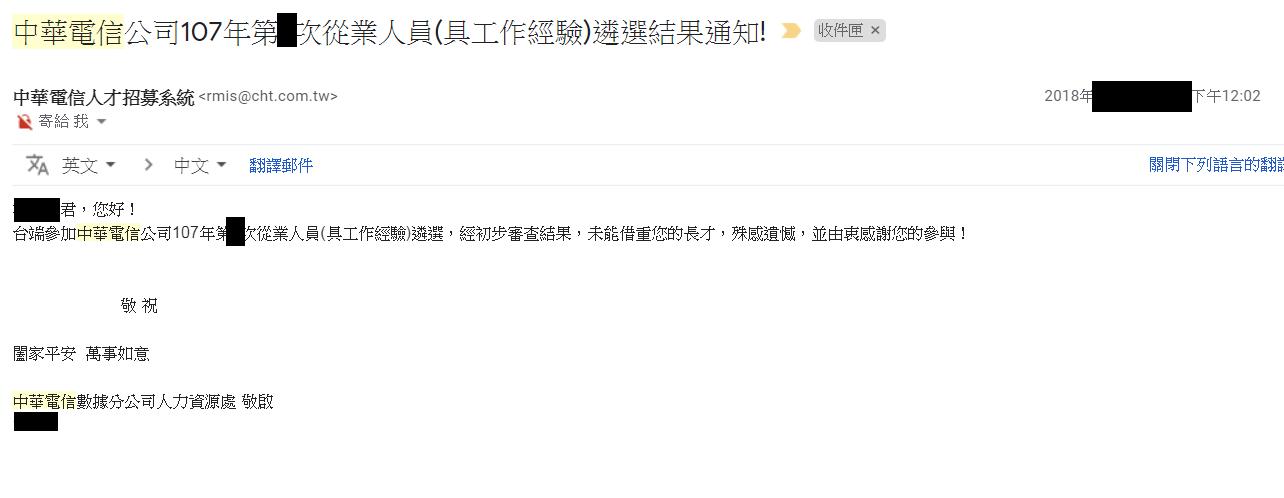 前面提到了,投了很多次,都是收到了落選的通知信件,那麼第一次面試錄取的郵件是長什麼樣的?給大家看一下