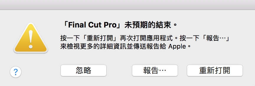 最近換了Mac SSD硬碟後,沒有網路上大家說的休眠的問題,但出現了Final Cut Pro輸出影片的時候,就會閃退(crashes),也就是當掉,什麼畫面都沒有,只有跳出一個訊息框,傳送報告、忽略的什麼訊息。我當時使用的版本是 10.3.4。